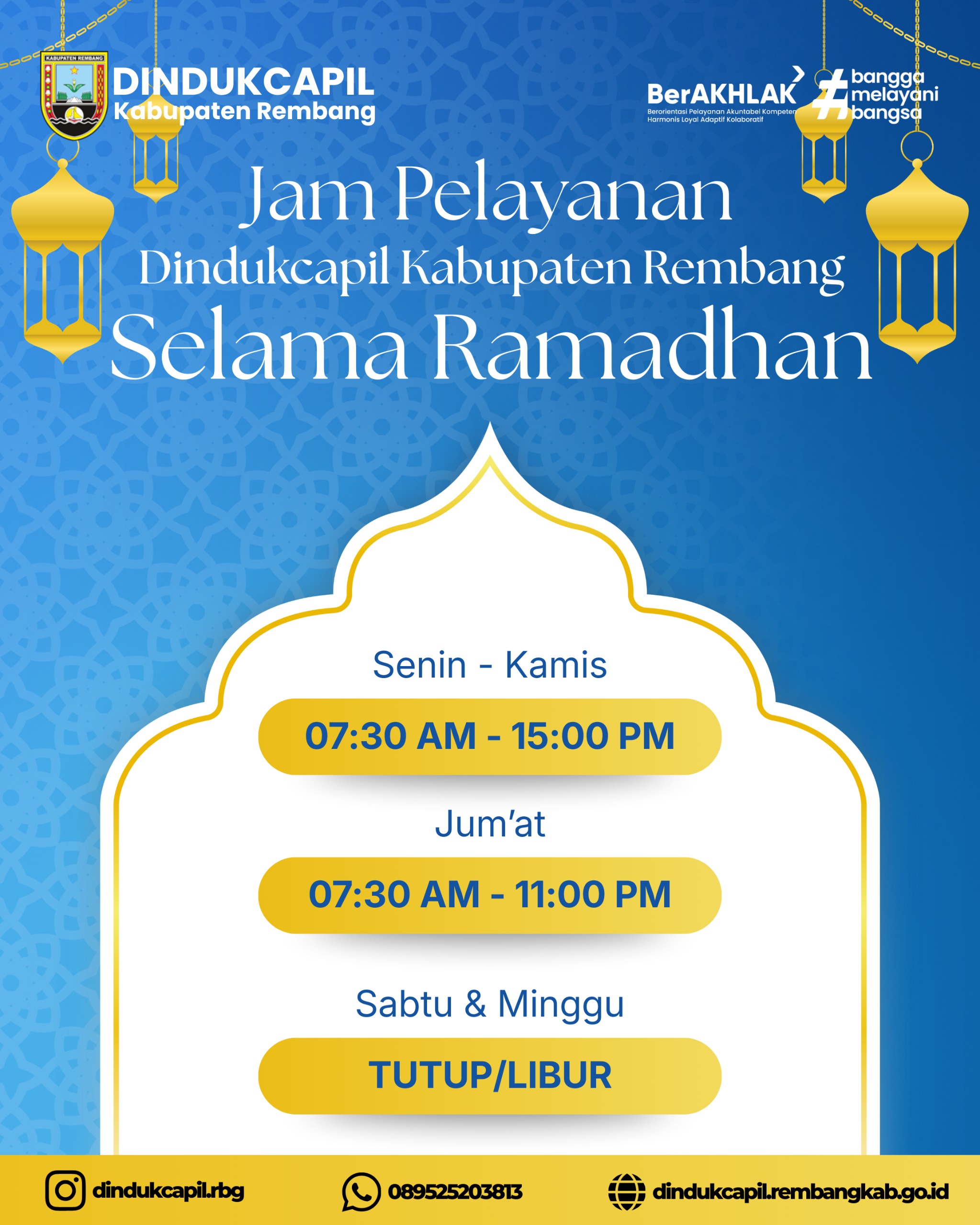 Dalam rangka menyambut dan menjalankan ibadah di bulan suci Ramadhan, jam pelayanan dokumen kependudukan Dindukcapil Kabupaten Rembang menyesuaikan sebagai berikut: