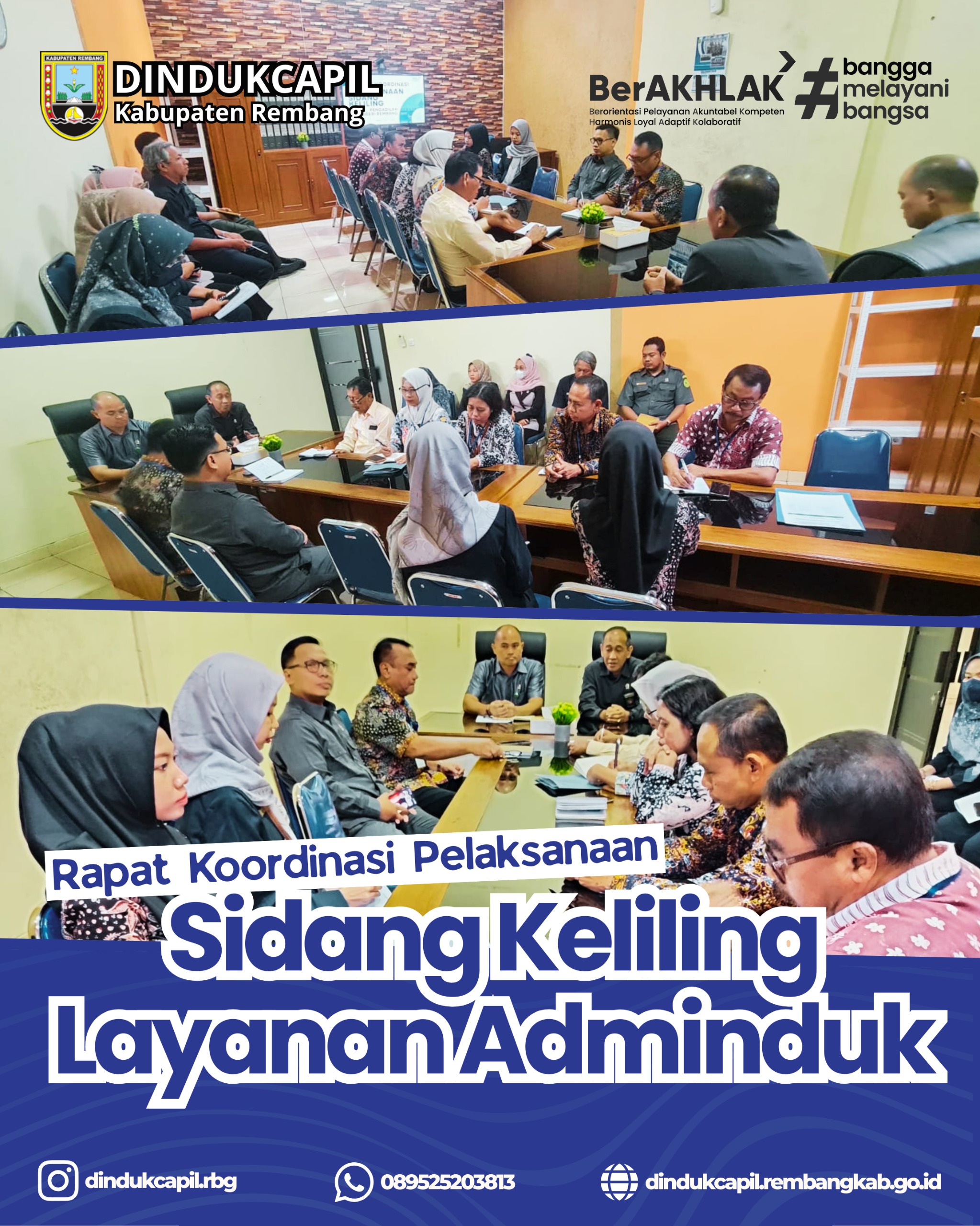 Selasa, 3 Maret 2026 - Dindukcapil Rembang menghadiri rapat koordinasi sidang keliling layanan administrasi kependudukan. Rapat koordinasi ini diselenggarakan oleh Pengadilan Negeri Rembang guna menyamakan persepsi, memantapkan steknis serta memperkuat sinergi antar instansi guna pelayanan prima kepada masyarakat.