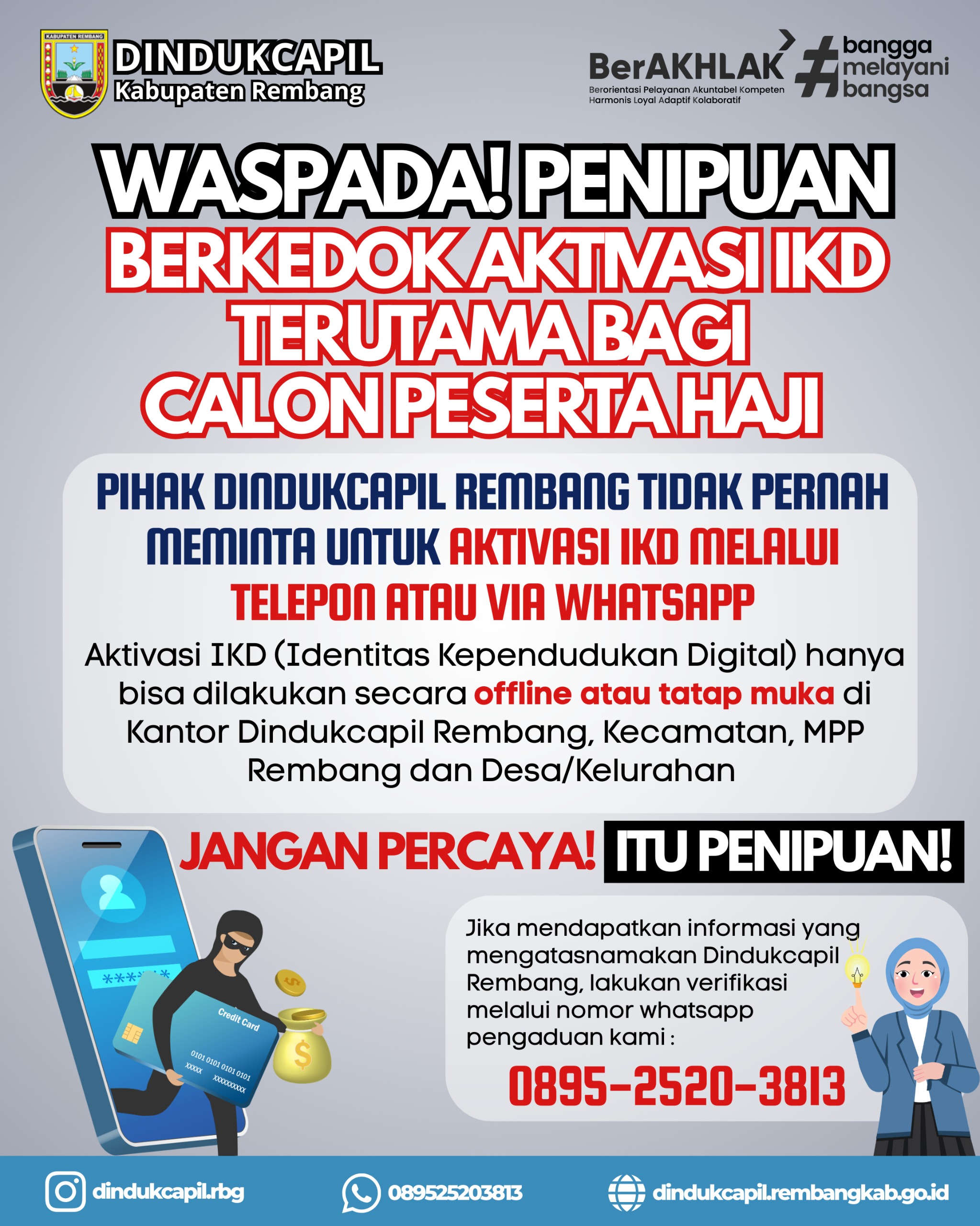 Waspada modus penipuan mengatasnamakan petugas dukcapil untuk aktivasi IKD (Identitas Kependudukan Digital) melalui telepon atau whatsapp. Silakan melapor ke nomor pengaduan kami di nomor 089525203813