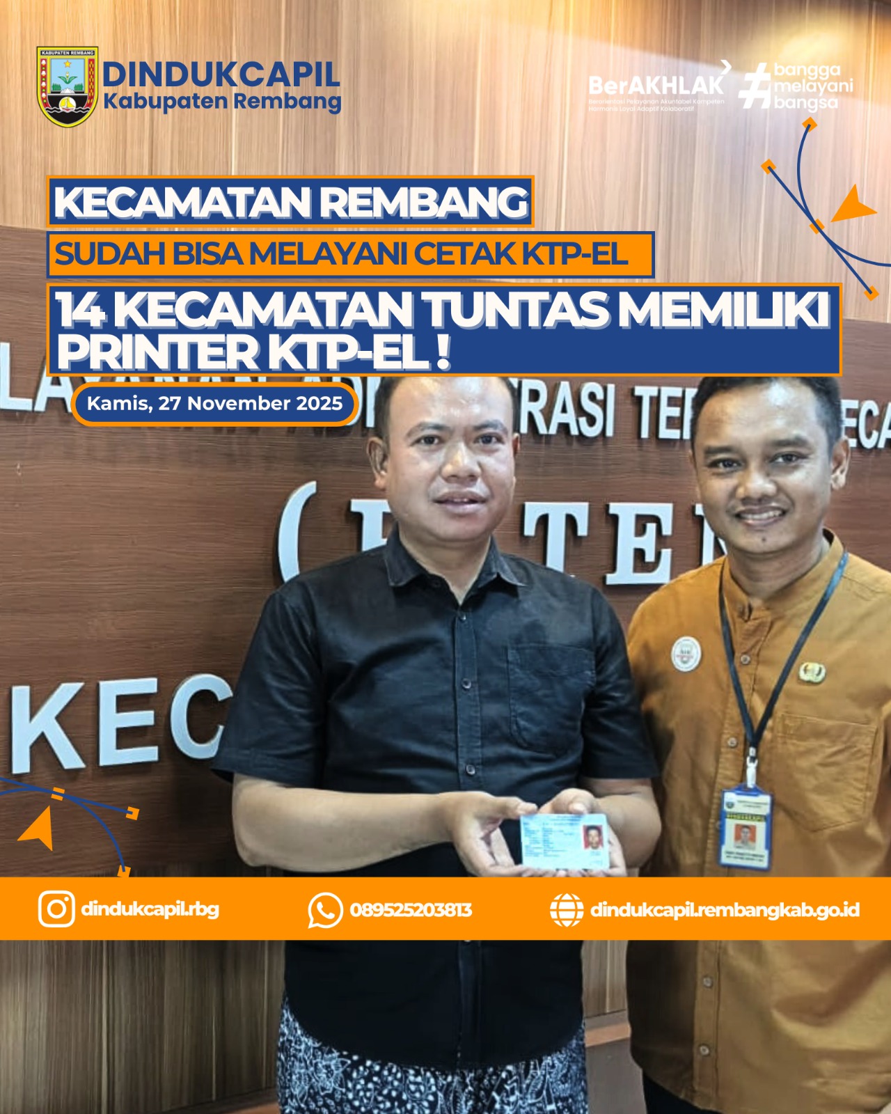 Kecamatan Rembang menjadi Kecamatan yang terakhir dalam pendistribusian printer cetak KTP-el oleh Dindukcapil Rembang. Akhirnya Dindukcapil menuntaskan pendistribusian printer KTP el di semua kecamatan di Kabupaten Rembang. Sekarang, warga masyarakat Kabupaten Rembang bisa melakukan cetak KTP-el di Kantor Kecamatan terdekat! ????