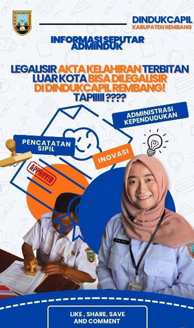 Halo Sedulur Dukcapil Rembang! Jika njenengan ber KTP-el Kabupaten Rembang tapi Akta Kelahiran njenengan terbitan dari luar kota, tidak perlu khawatir untuk meminta legalisir , karena njenengan bisa mengajukan keabsahan di Kantor Dukcapil Rembang tanpa harus ke Kota/Kabupaten terbitan Akta njenengan.
